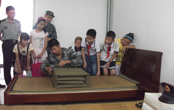 “好激动,我以前一直觉得解放军叔叔是最厉害的,今天我终于可以亲自去一次部队,觉得好开心。”大观区长江小学的董妹说。7月12日,实践服务团赴南京军区安庆驻地顺利开展了部队夏令营活动,来自大观区长江小学40余名同学和安庆市高崎小学20学生参与了此次活动。孩子们在部队教官的带领下有序地观看了军事展板,听了一堂国防教育课,参观了器械室和步兵内务室。活动的开展极大丰富了小朋友们的暑期生活,对树立正确的国防意识和形成健康的生活习惯具有积极的意义。