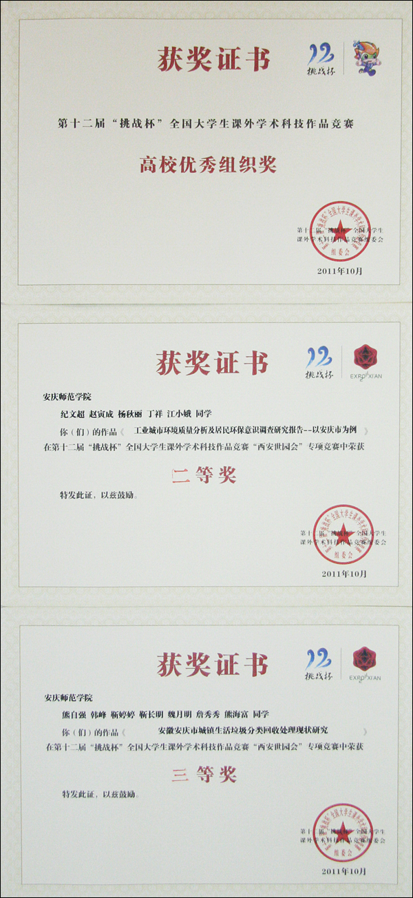 备战“挑战杯”期间,校党政领导的高度重视,各相关部门和学院鼎力支持,指导老师悉心指导,参赛同学认真准备,在今年的校级比赛中,参赛作品数量和质量较之往年都有了较为明显的提升,共有330件参加比赛,直接参与比赛的同学近3000人次。校内比赛结束后,学校选派专业老师加强指导,不断完善作品内容,提高作品的层次。2011年5月,威尼斯官网选定了6件作品参加第四届“挑战杯”安徽省大学生课外学术科技作品竞赛终审决赛,取得了2件一等奖,4件二等奖的好成绩,学校再次捧得“优胜杯”。这次“挑战杯”全国大学生课外学术科技作品竞赛终审决赛中,由资源环境学院的陈书琴、刘俊老师指导,王曼、戴敏、杜新、万茹、王玉、李冠英等同学的作品《流域表土营养盐空间分布及面源污染控制对策研究--基于巢湖周边土壤中全氮、全磷和有机质空间分布的调查》荣获一等奖;由经济管理学院彭长生、黄先军老师指导,陶主、彭欣、杨圆圆、毛舒文、崔尔婷、岳莉沙的作品《城乡一体化进程中农村宅基地退出和流转意愿的调查报告》荣获二等奖;“西安世园会”专项竞赛中,威尼斯官网选送的由资源环境学院徐志兵教授指导,纪文超、赵寅成、江小娥、杨秋丽、丁祥等同学作品《工业城市环境质量分析及居民环保意识调查研究报告--以安庆市为例》获得全国二等奖,钮志远老师、张群教授指导,熊自强,魏月明,詹秀秀,靳长明,靳婷婷,熊海富等同学作品《安徽安庆市城镇生活垃圾分类回收处理现状研究》获得全国三等奖。