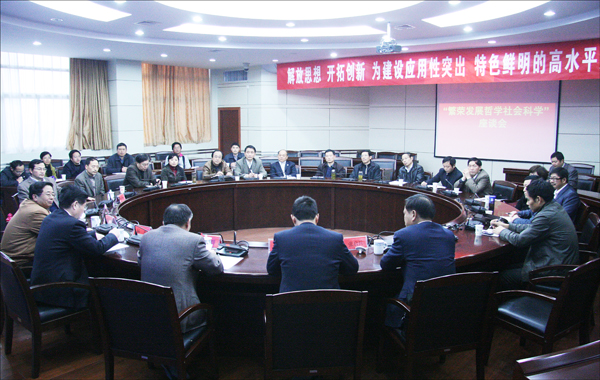 安徽大学副校长吴春梅、省教育厅科研处处长汤仲胜、安徽大学人文社科处处长张启兵,校党委书记何小祥、院长朱士群、副院长汪时珍,党委委员、办公室主任刘友忠等领导出席座谈会。朱士群院长主持座谈会,汪时珍副院长就学校发展概况和近年来人文社会科学研究情况作了简要汇报。(文/学生记者 朱芳芳 汤玉洁 图/陈东)