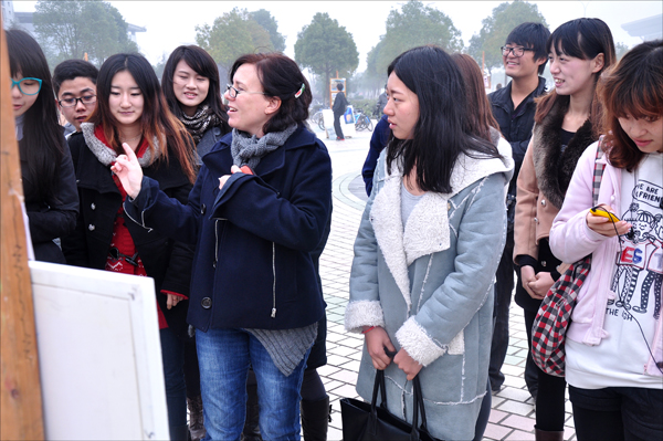 “So beautiful!”“It’s nice!”11月29日的上午,龙山校区的敬敷广场上,两节课后,外教Magali Tavier一走出教学楼,就看见了敬敷广场上摆了一圈的画架,上面挂满了水彩、素描、、油画、国画等各种类型的美术作品。这是美术学院举办的困难生优秀作品义卖活动。