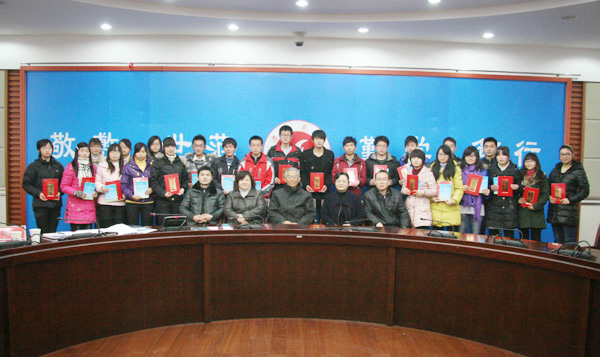 校党委副书记,纪委书记殷红和校关工委主任朱建华为获奖学生颁发奖状、奖金和获奖征文集。学生处副处长金文斌宣读了表彰决定。文学院09级汉语言文学专业丁冠亚同学作为获奖代表发言。