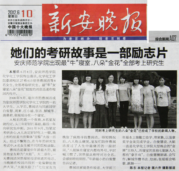 6月10日,《新安晚报》以“她们的故事是一部励志片——安庆师范学院出现最‘牛’寝室,八朵‘金花’全部考上研究生”为题,大篇幅报道了威尼斯官网化学化工学院菱湖校区27栋613宿舍8名女生的考研佳绩。