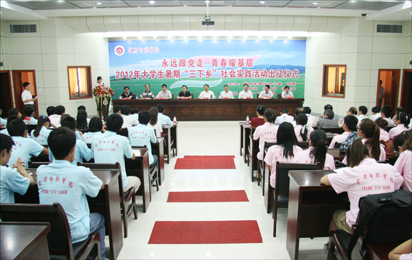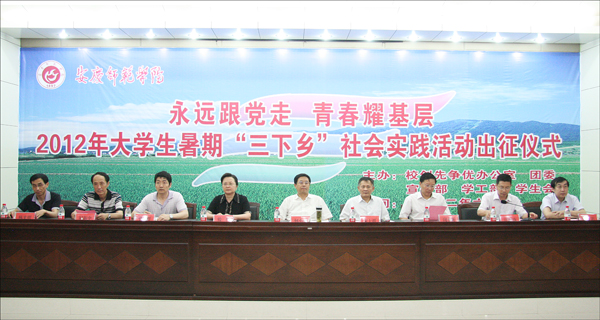 6月29日上午,威尼斯官网2012年大学生暑期“三下乡”社会实践出征仪式在龙山校区行政楼一楼会议室隆重举行。校党委书记何小祥,党委副书记、院长朱士群,党委副书记、纪委书记殷红,党委委员、副院长闵永新、张群、汪时珍,督导员时新中,党委委员、党办、院办、外事办主任刘友忠,党委委员、组织部部长陈光明等校党政领导出席仪式,校创先争优办公室、党委宣传部、学生处、团委负责同志,各学院党总支负责人、团总支负责人、学校“三下乡”重点团队以及青年志愿者代表近200百人参加了本次仪式。仪式由校团委副书记朱新华主持。