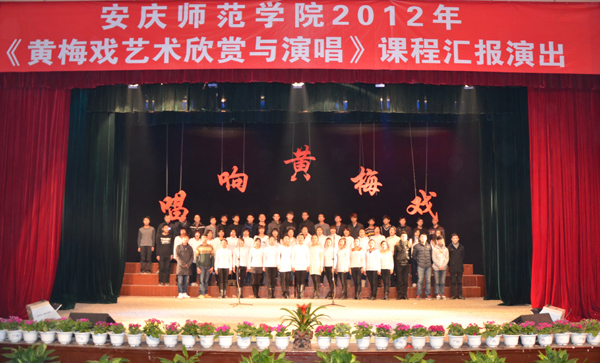在每年课程学习结束的时候,《黄梅戏艺术欣赏与演唱》都会安排公选课学生与黄梅戏专业学生、大学生黄梅剧艺术团成员共同参与汇演晚会,从开设至今,这台晚会已经成为了这门课程的一大特色,真正是把黄梅戏的教学从教室搬上了舞台。(教务处)