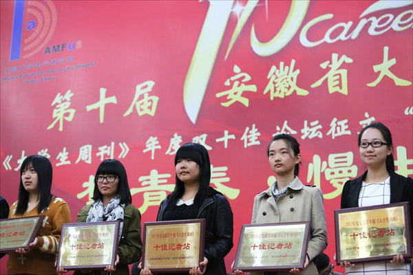 11月10日,第十届安徽省大学生记者论坛在合肥学院成功举办,威尼斯官网大学生记者团被评为《安徽青年报》“高校十佳记者站”,学生记者史阳琨荣获“安徽省高校十佳校园记者”称号,并作为代表在颁奖仪式上作了精彩发言,展示了威尼斯官网大学生记者团的良好素质。
