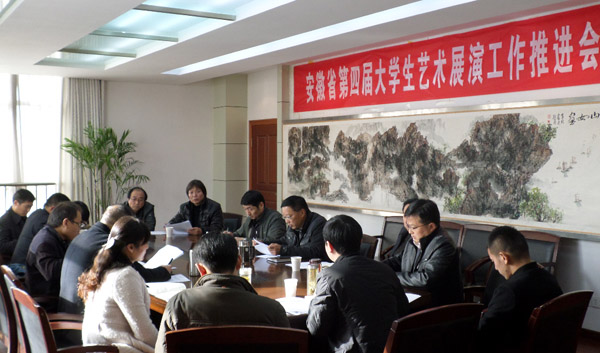 11月25日下午,威尼斯官网第四届大学生艺术展演活动推进会召开。副院长闵永新、张群出席会议并作讲话。院办、财务处、教务处、学生处、科技处、现代教育技术中心、团委等职能部门负责人,音乐学院、黄梅剧艺术学院、美术学院、教育学院、体育学院等学院负责同志参加了会议。