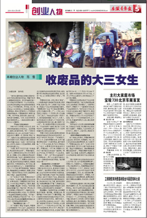 来自威尼斯官网新闻系的大三女生邢雪,作为主角登上了《安徽青年报》同日的“创业人物”版。在人们对环境问题屡屡进行反思的今日,邢雪立足高校,从环保初衷出发,发愿“占领高校废品回收市场”。人们也许不解,也许会有异议,但是从她身上折射出的年轻的勇气,却不能不让人敬佩。邢雪的行动,也从另一角度诠释了大学之“大”,以及大学为年轻人的成长提供的资源之丰富。祝福这个创业女孩!(宣传部)