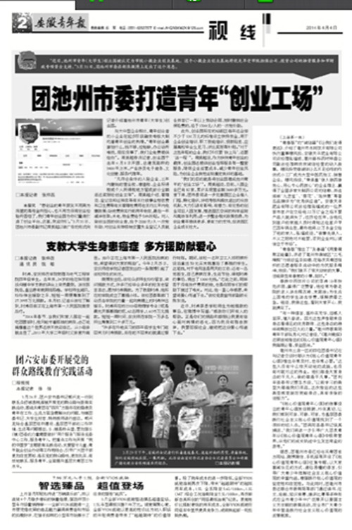 4月4日,《安徽青年报》分别在“视线”与“创业人物”专版,刊登和威尼斯官网有关的两则新闻。