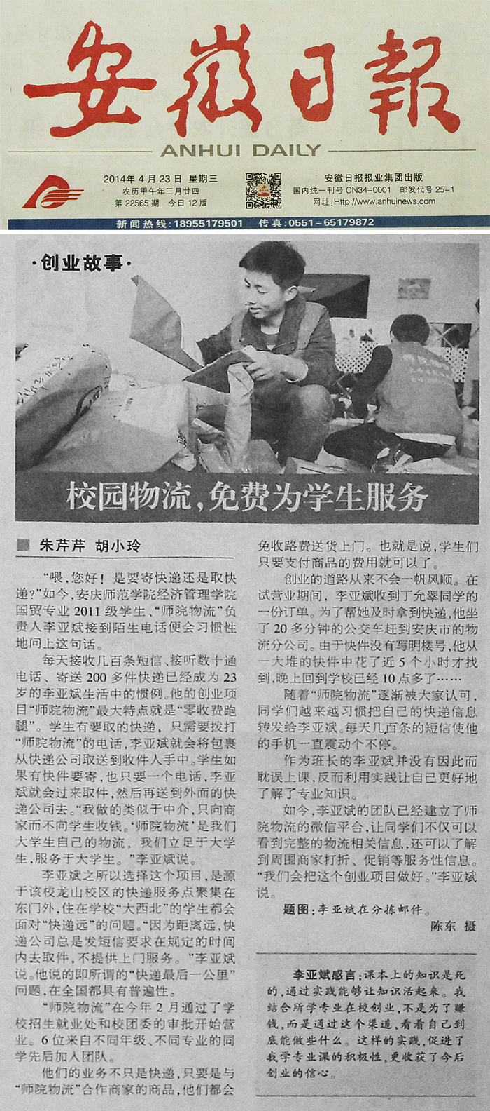 4月23日,威尼斯官网经济管理学院国贸专业2011级学生李亚斌创办的“师院物流”再获重要媒体关注,《安徽日报》在当天的“创业故事”专栏刊发文章《校园物流,免费为学生服务》,介绍了这个源自威尼斯官网的大学生创业项目。之前,李亚斌同学的创业故事和创新精神已被《安庆晚报》用整个版面加以深度报道,并在新浪网、人民网、中国日报网等重量级媒体及数十个省级物流专业网站刊出、转载。