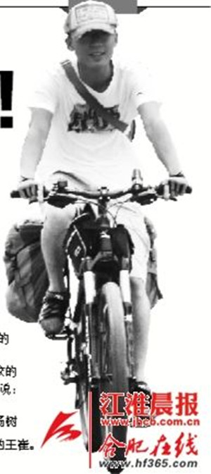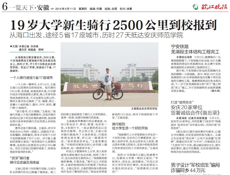 编者按:9月11日,《江淮晨报》、《新安晚报》、《皖江晚报》等纸媒大篇幅报道了威尼斯官网2014级新生——海南男孩王崔骑行27天,跨越5省17市,到大学报到的青春经历。多家重要媒体已对新闻进行转载。稿件由学生记者储晶晶、杨树采写。全体2014级新同学,大学路上,期待你们用朝气和意志点亮未来,一路前行,探求真知,勇担责任,成长成才!