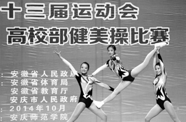 10月17日,省十三运高校部健美操比赛在安庆师院开幕。比赛分竞技健美操和健身健美操团体、单项,共设甲乙丙三组、19个项目、29块金牌,来自全省27所高校、31支代表队参赛,比赛将持续到20日。图为18日进行的女子三人健美操预赛。