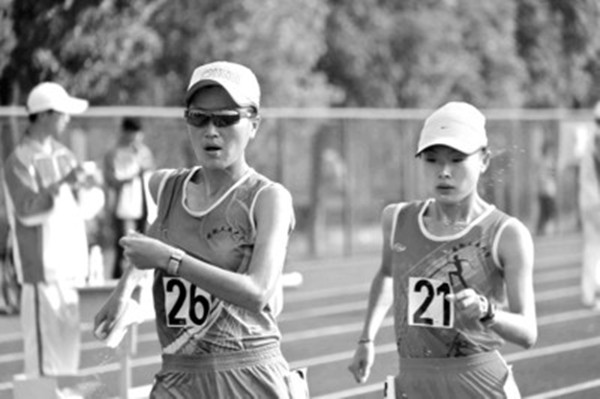10月11日,在安庆师范学院进行的安徽省第十三届高校部田径运动会上,亚锦赛冠军周同美(左)在5000米竞走项目中,以0.3秒的微弱优势险胜亚运会冠军吕秀芝获得金牌,成绩为24分57秒62。