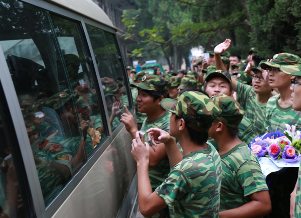 获奖图片反映军训结束时,新生的不舍。画面里新生们挥一挥手,与教官就此别过,他们没能和带他们走过一段特别人生旅程的教官“亲密接触”,手上捧着的花没有能够送出,只能隔着车窗玻璃说再见。车窗玻璃上印着新生们身着军训服的模样,这应该是他们最后一次身着军训服,严密的车窗背后的教官或许只是新生们人生中的过客。但虽然是短暂的时光,新生们却收获了坚韧的毅力、顽强的品质和强烈的集体意识,也与教官们建立了一份不舍的情谊。