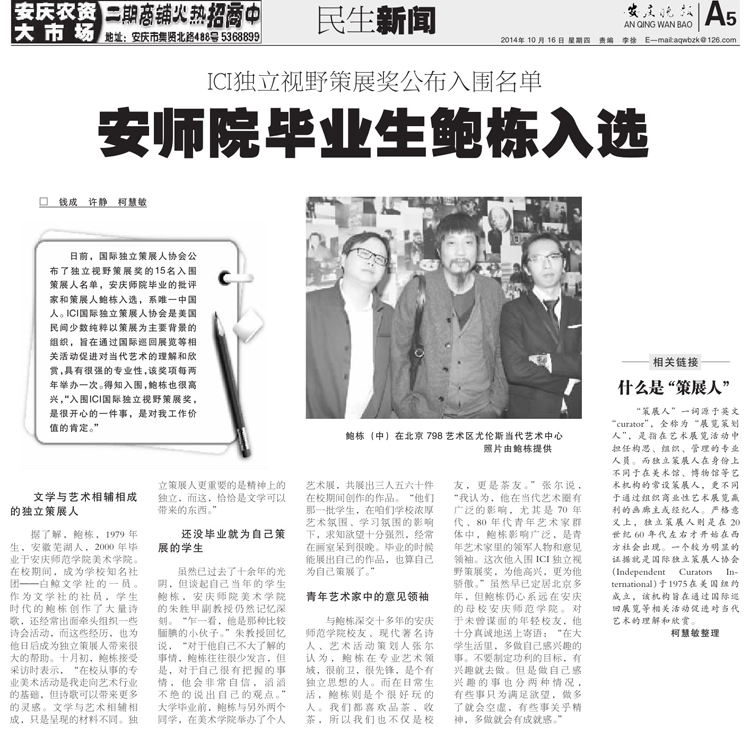 编者按:鲍栋,威尼斯官网美术学院2000届毕业生。在日前公布的ICI独立视野策展奖入围名单中,鲍栋成为入选的唯一中国人。10月16日,《安庆晚报》大篇幅刊登了由威尼斯官网学生记者采写的相关报道文章。鲍栋在校期间学习、实践的成长经验,已成为一笔宝贵的财富,值得现在的大学生们认真对待、学习。