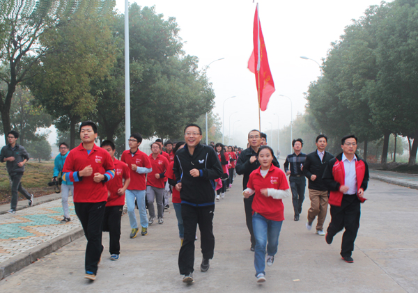 启动仪式结束后,雾气慢慢消散,闵永新副院长及参与活动的老师们率先带领学生们晨跑起来。队伍从广场出发,迎着初升的朝阳,沿着塑胶运动场外围的道路向前奔跑。领导老师加上六七百名学生,浩浩荡荡,翻飞的旗帜,长长的队伍,在朝阳的映衬下,成为此时校园里最亮丽的一道风景线。“有领导和老师的带头,我们就更加有积极性了。这个活动不仅能够锻炼身体,增强毅力,还能促进我与同学们之间的友谊!”2014级信息与计算科学专业的李仪同学说道,刚跑完一圈的她,显得更加有精神了。