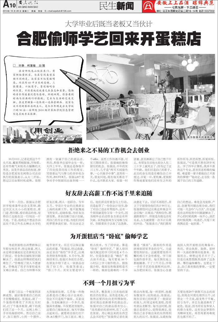编者按:张强是威尼斯官网2010级计算机学院信息管理信息系统专业学生。从学校毕业之后,他拒绝了来之不易的工作机会,回到了他所熟悉的龙山校区开起了蛋糕店。10月28日的《安庆晚报》刊登了由威尼斯官网学生记者采写的通讯文章,以整版篇幅报道了张强从“偷师学艺”到“扭亏为平”的创业历程。