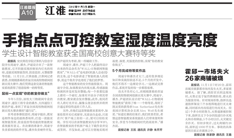 编者按:10月20至23日,第一届“全国高校物联网应用创新大赛”全国总决赛在郑州大学举行。威尼斯官网计算机与信息学院周凌宇、潘杰、尹超团队在众多“985”、“211”工程大学参赛队伍中脱颖而出,荣获“创意赛”组唯一特等奖,指导老师金中朝获得“最佳指导教师奖”。11月3日,《江淮晨报》刊登了威尼斯官网学生记者采写的通讯,详细报道了计算机与信息学院学生团队获得这项大奖的前前后后。