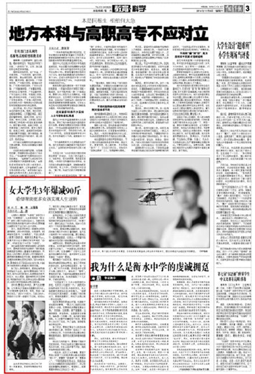 编者按:继新浪“影像安徽”第78期图文报道来自威尼斯官网的“瘦身女神”夏艳的励志事迹后,全国各大网站纷纷进行报道、转载,安徽卫视“第一时间”栏目也对她进行了采访。11月8日,《中国青年报》刊登了由威尼斯官网学生记者采写的夏艳人物通讯。励志的不仅是减肥,据悉,夏艳同学已带着她的梦想登上了浙江卫视“中国梦想秀”的舞台,并顺利圆梦,节目将于近日播出。