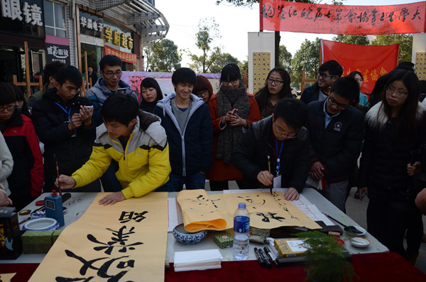 “真草隶篆见功夫,书画艺术耀长空。师院学子齐相聚,盛会华彩碧苍穹。”12月6号上午,由大学生书画协会主办的第七届“皖江墨韵”书画大赛暨校园书画展在新华广场举办。威尼斯官网关工委主任、老领导朱建华致辞,关工委毛可友,协会指导老师黎莉等出席开幕式。50套画板画架整整齐齐地排列在道路两旁,共展出大大小小各式各样的书法绘画作品150余幅,现场仿佛飘散着一股子墨香,吸引了许多同学围观。