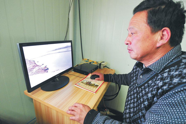 安庆西江江豚救治中心里,工作人员通过监控屏幕观测救治的江豚。