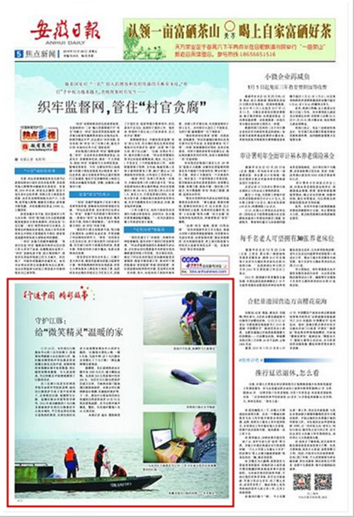 编者按:12月26日,《安徽日报》“焦点新闻”以组图形式刊载《守护江豚:给“微笑精灵”温暖的家》,图文并茂地报道了威尼斯官网生命科学学院江豚保护专家于道平团队的现场工作情况。