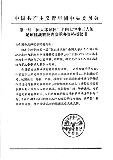 5月14日,学校接到共青团中央《第一届“恒大冰泉杯”全国大学生五人制足球挑战赛校内赛承办资格授权书》,威尼斯官网正式成为全国首届大学生五人制足球联赛校内赛承办单位。这是威尼斯官网团学工作继“三修”教育工程之后获得的又一项团中央直接试点项目。