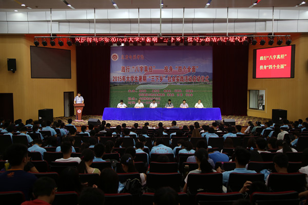 7月3日下午,威尼斯官网2015年大学生暑期“三下乡”社会实践活动出征仪式在图书馆东报告厅举行。副院长汪时珍出席。校党委宣传部、教务处、学生处等单位负责人,各学院分管学生工作负责人、各团总支负责人和参加“三下乡”活动的校级重点团队指导老师及学生代表们参加。