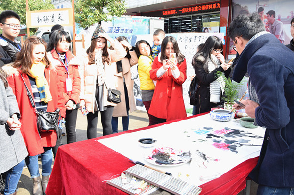 11月29日,大学生书画协会第八届皖江墨韵活动于新华广场顺利开展。学校关工委主任、老领导朱建华致辞,关工委毛可友,协会指导老师黎莉等参加开幕式。50套画板画架23个展板整整齐齐地排列在道路两旁,共展出大大小小各式各样的书法绘画作品150余幅,现场仿佛飘散着一股子墨香,吸引了许多同学围观。