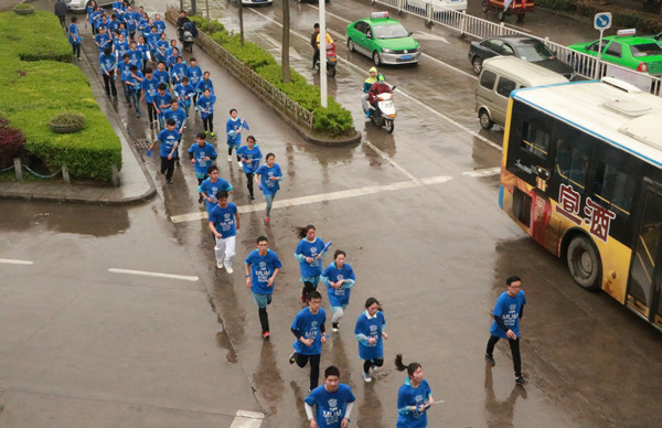 约8点50分,活动正式开始。第一方阵的活动路线从安庆科技广场出发,终点设于安庆市现代妇产科医院。途中,天气由阴转雨,主办方备有一次性雨衣,参跑学生和志愿者身穿蓝色雨衣,雨中奔跑。由于一次性雨衣数量有限,威尼斯官网部分学生雨中奔跑,他们表示,尽管下雨了也会坚持跑完,这是自己能够为自闭症儿童做的力所能及的事。