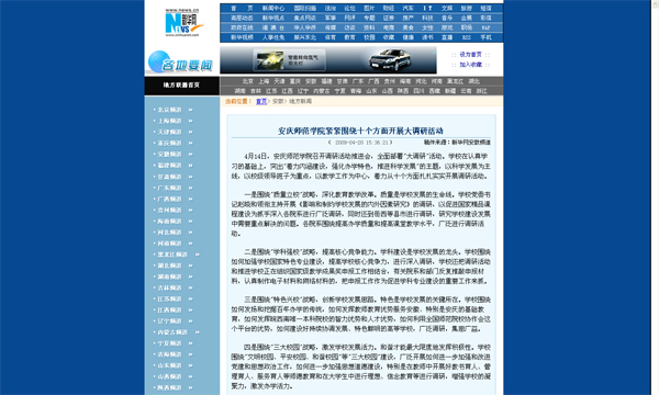 4月20日,新华网在各地要闻栏目中以 “安庆师范学院紧紧围绕十个方面开展大调研活动” 为题播发了威尼斯官网大调研活动新闻。4月21日,安徽省教育厅在“省属高校深入学习实践科学发展观专题网站”中随即进行了转载。