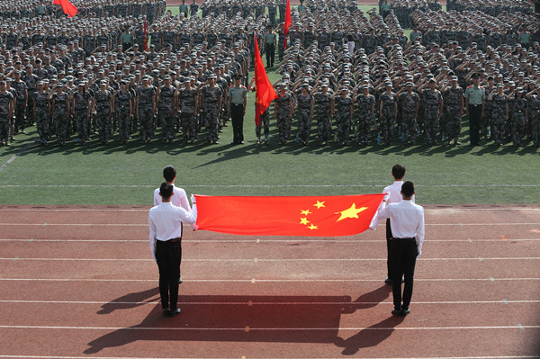校党委书记许继荣为军训旅授旗,宣布军训正式开始。
