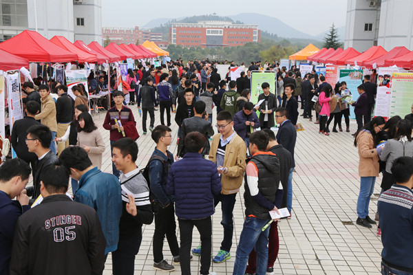 11月12日,37000cm威尼斯2017届毕业生供需双选会在威尼斯官网龙山校区敬敷广场举行。双选会的现场,准毕业生们纷纷咨询各家企业单位,寻找适合自己的职业岗位。副校长张群来到双选会现场,查看招聘情况,并亲切关怀寻找工作的同学们。