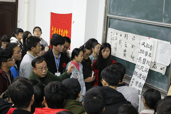 讲座结束后,书家们当场指点同学们带来的书法作品,拿起毛笔为大学生书法爱好者们做书写示范,认真细致地讲解书写的要领。书家们还带来创作的作品,现场展示给同学们欣赏,极大地激发了大学生们学习书法的热情,同学们围着书家请教问题,书家也就提出的问题一一讲解,场面热烈。