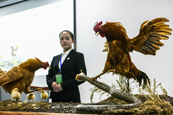 现实生活中,你可能很容易见到蛇捕雏鸡、母鸡护崽、公鸡斗蛇的画面,但是,三个画面合为一体就很难见到了。在创新创意组,来自于安徽师范大学的参赛队员们很好地将这三个场景融为一体。四只小只被母鸡护在身后,母鸡顶毛头耸,目光逼人。在母鸡身前,一只身体前半段腾空的蛇嘴里叼着一只鸡仔。一只愤怒的公鸡竖直鸡冠、双翅振开,右爪死死抓住蛇的七寸。