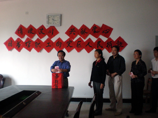 2008年5月12日下午14时28分,四川省汶川县发生里氏8级强烈地震,灾情严重, 图书馆全体职工情系汶川灾区人民。5月15日下午,在支部书记许昆云馆长的带领下,积极捐款,共献爱心,部分临时聘用人员也主动来到募捐点,伸出援助之手。在短短时间内,捐款共计人民币6170元。(图书馆)