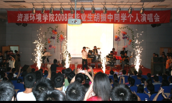胡振中是资源环境学院2004级学生,曾担任院学生会文艺部长等职。演唱会上,胡振中以他独特而又雄浑的声音诠释了艺术的魅力,深情演唱了《一生有你》、《你知道我在等你吗》和《海阔天空》等十几首经典歌曲。他激情的表演感染了在场的每一位观众,演出现场始终环绕着浓重而热烈的气氛。音乐学院毕业生也在演唱会上倾情献歌,他们与胡振中之间交融穿插的精彩表演使得整场演唱会高潮迭起,掌声雷动。