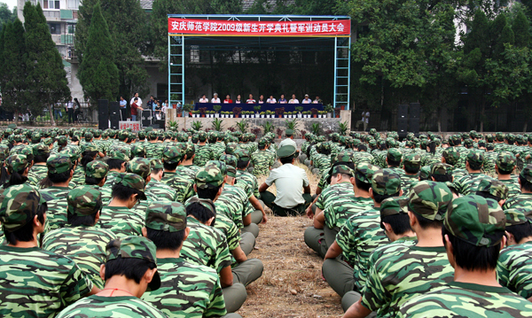 武警安庆支队副支队长胡庆南、副参谋长华冬元对全体军训教官和参训同学作了军训动员;教师代表、省级教坛新秀、化学化工学院郭畅老师和省级教坛新秀、文学院岳秀文老师以及2009级硕士研究生代表中国古代文学专业罗丹同学、本科新生代表黄梅戏表演专业傅亚红同学、环境科学专业张涛同学也分别在开学典礼上作了发言。
