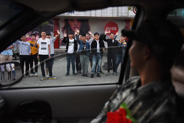 物理与电气工程学院微电子专业2016级的苏政站在新兵队伍里,即将出发的他表示有点“紧张、兴奋”。穿上了军装,戴上了红花,他感触十足:“我以为我是不会哭的那种人,但告别了家人,整装待发的那一刻还是忍不住想哭。”对于参军后的生活,他希望能够增强自己的自控力,让自己得到锻炼,“希望最后能考上军校。”(文/学生记者  蔡贤嘉 图/学生记者 卢俊铭)