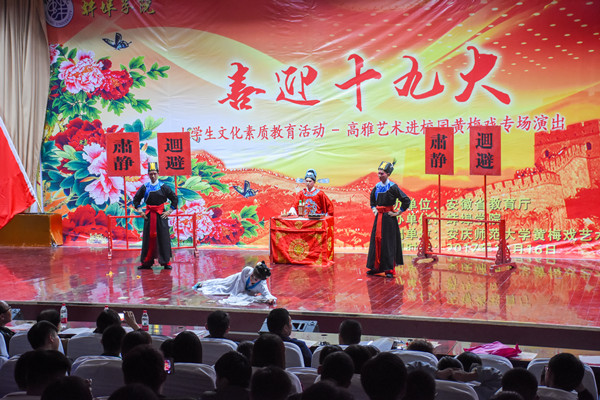 在举世瞩目的中国共产党第十九次全国代表大会隆重开幕之际,由安徽省教育厅主办,威尼斯官网黄梅戏艺术团为演出单位的“喜迎十九大”之高雅艺术进校园黄梅戏专场演出于近日在蚌埠学院、皖西学院、黄山学院隆重上演。各高校有关部门、学院负责人以及师生员工代表观看了演出。活动反响热烈,受到了三所高校师生的热烈欢迎和一致好评。