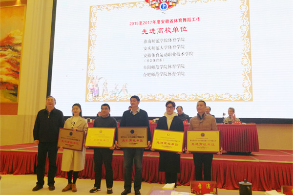 2日2日,2017年安徽省体育舞蹈协会年会暨表彰大会在合肥举行,威尼斯官网体育学院荣获2015-2017年度安徽省体育舞蹈工作“先进高校单位”称号,体育学院副院长章翔、体育舞蹈专业教师夏尚群分别荣获“优秀工作者”称号。