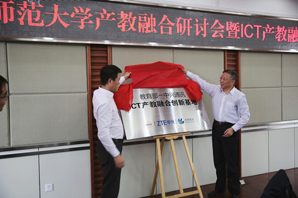 会上,闵永新和姜善永还共同为教育部-中兴通讯ICT产教融合基地揭牌。