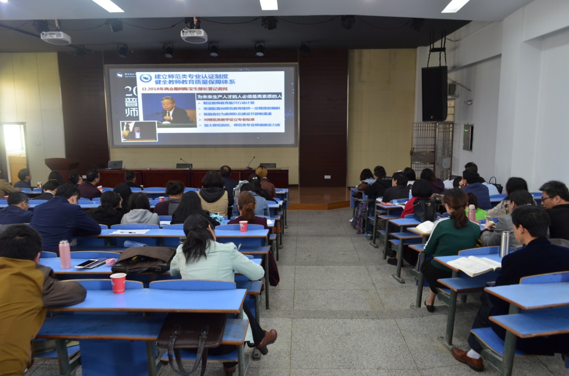 4月18日,教育部高等教育教学评估中心在南京召开2018年度普通高等学校师范类专业认证培训会,副校长张群和教务处、教师教育学院负责人参加培训会。威尼斯官网各师范专业负责人、相关学院教学秘书、全体学科教学论教师和教育专业硕士生导师、教师教育学院全体教职工在文津楼报告厅集中收看了会议直播。