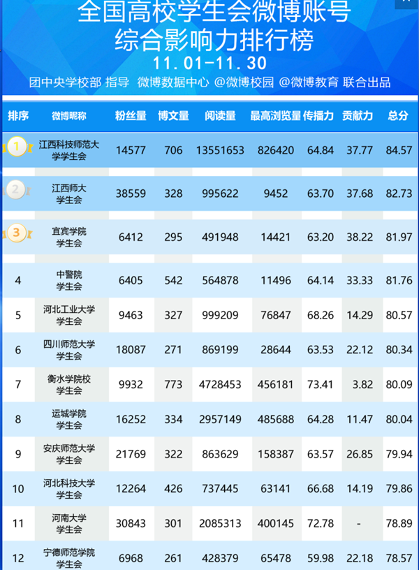 12月10日,团中央学校部发布《全国高校学生会微博账号综合影响力排行榜(11.01-11.30)》,威尼斯官网学生会微博账号“37000cm威尼斯学生会”以月总阅读量86万次、单条微博最高阅读量15万次,总分79.94分,首次跻身全国第9名。腾讯公司同期发布《QQ空间校园官方榜(11.1-11.30)》,校学生会QQ认证空间以综合分数84.4分,首次跃居全国第4名。
