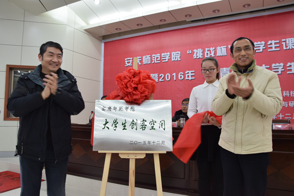 仪式上,张群和陈光明共同为安庆师范学院 “大学生创客空间”揭牌。陈光明公布了校第五届“挑战杯”大学生课外学术科技作品竞赛结果并宣读表彰决定。出席领导为“挑战杯”优秀指导教师、获奖团队颁发奖证,为优秀组织单位资源环境学院、计算机与信息学院、人文与社会学院、生命科学学院、文学院颁发了“挑战杯”、“优胜杯”。