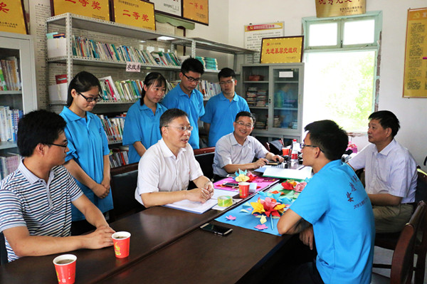 8月2日上午,校长闵永新在团委负责同志和大龙山镇党委书记邓建群等陪同下,冒着烈日酷暑前往大龙山镇桃元社区,亲切慰问校学生会“启明星”关爱留守儿童暑期实践服务团队,并向社区的小学生们赠送了学习用品。