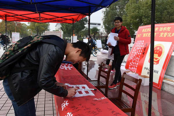 据悉,法学院的宪法宣传活动除了校内和校外的宣传外,还将陆续开展一系列主题活动,深入贯彻宪法精神,让宪法持续升温,努力建立法制校园。(文/学生记者 李海云 图/学生记者 黄庆)