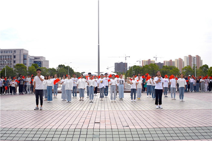 中午放学铃声一响,手持五星红旗,整装待发的快闪小队迅速各就各位,摆好队形。吉他手弹唱《今天是你的生日》将原本要放学离开的学生吸引到广场上来。伴奏响起,合唱团齐声演唱歌曲,嘹亮的歌声在广场上空萦绕不绝。围观的学生越来越多,并都自发地领取了五星红旗,跟着合唱团一起挥舞歌唱。广场上逐渐形成了近千人的红色方阵,共同唱响对祖国的赞歌。