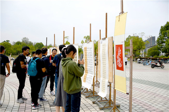 快闪结束后,“献礼新中国70华诞作品展”在广场上展出。现场展出的陶艺、剪纸、书法等不同种类的五十余件作品,均来自安庆师大各艺术俱乐部学生的手工制作。中国地图的剪纸作品、赞美祖国河山的书法作品、形态各异的陶艺作品……引得不少学生驻足观看。