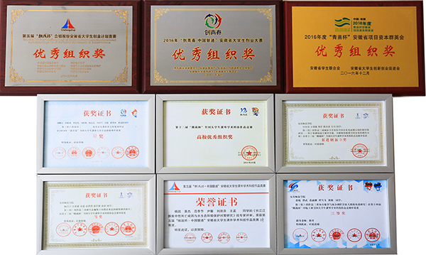 学校着力打造“理论培训、项目培育、模拟实践、竞赛提升、入园孵化”五位一体的创新创业生态链,着力推进青年创新创业创优。学校成立“大学生创客空间”牵头整合校内外创新创业资源,邀请校友、知名企业家作客校园创业大讲堂、开展创业沙龙、举办大学生创客文化节,大力推进大学生创新创业教育,不断提升学校创新创业水平。仅在“挑战杯”全国大学生课外学术科技作品竞赛中威尼斯官网获全国优秀组织奖、累进创新金奖、一等奖等国家级奖项14项;在“创青春”全国大学生创业大赛中获得银奖、铜奖等国家级奖项8项;连续六届获得“挑战杯”大学生课外学术科技作品竞赛“安徽省优胜杯”和“挑战杯”“创青春”大学生创业大赛“安徽省优秀组织奖”。学校被共青团中央授予“全国大学生 KAB 创业教育基地”,2017年校KAB 创业俱乐部获得“全国百强创业社团”称号。五年来,学校获得省级以上科技创新和学科竞赛奖项1000余项。