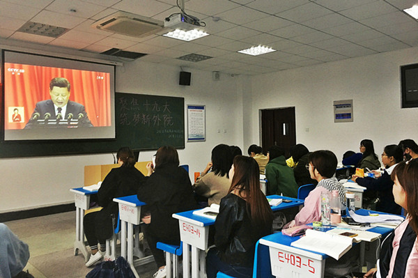 上午8:45,师生们就早早聚集到各会议室、活动室、教室、食堂、寝室,围坐在屏幕前收看开幕会盛况。在大学生活动中心,“喜迎十九大 迈出新征程”的横幅分外鲜明,校学生会、学生社团联合会、KAB创业俱乐部和各学院学生骨干近200人集中收看十九大开幕会直播,共同聆听了习近平总书记的报告。在总书记三个半小时的报告过程中,现场不时自发地响起如潮的掌声和喝彩声。